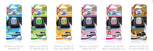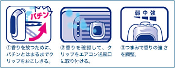 タバコ、エアコン、食べ物のニオイ…。そんな車の中のイヤなニオイをしっかり消臭して快適空間へと誘う、車専用消臭芳香剤。ワンタッチで装着できる、コンパクトなクリップタイプ。